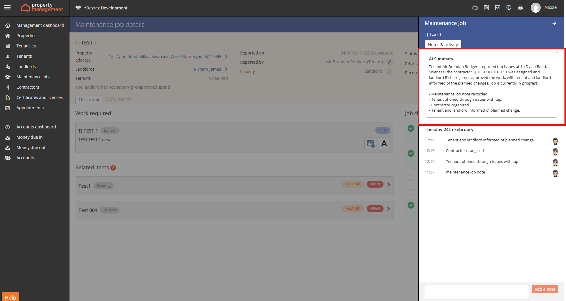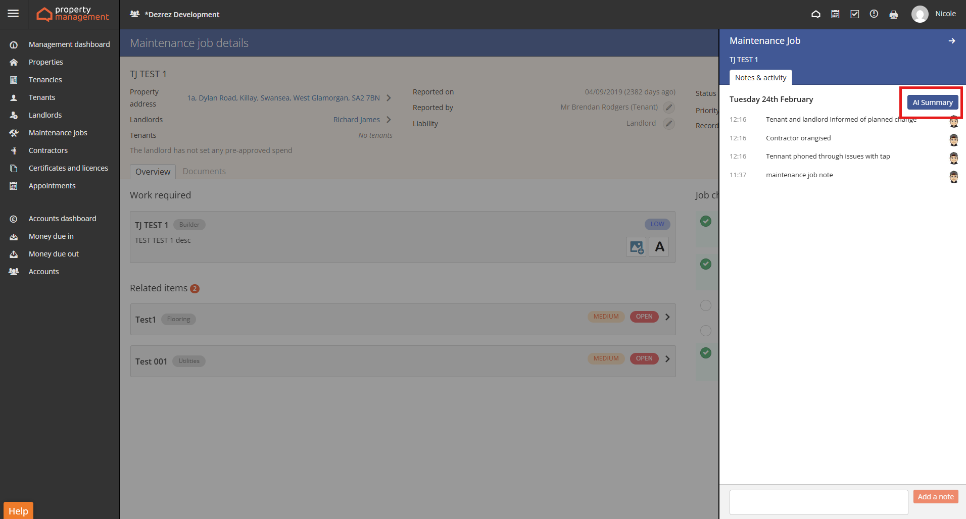 Maintenance jobs in Property Management now include an AI Summary option within the Notes & Activity panel.