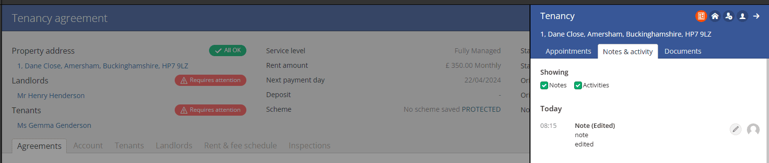 Notes: We had added the ability to edit Landlord, Company, Tenant, Tenancy and Property notes. To edit a note, select the pencil icon to the right of the note.