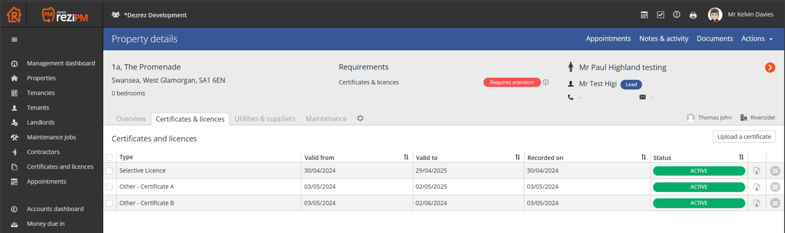 Any certificate added in Rezi will also appear in Rezi PM. Within ReziPM the new certificate type can be found within the Certificate License section: