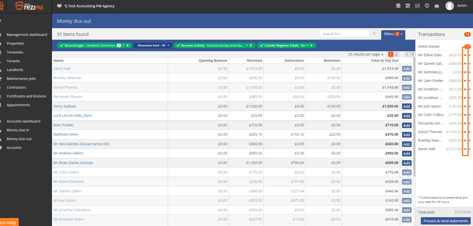 Accounting -> Money Due Out: We have released a change, which aims to simplify the flow the Money Due Out flow. Previously, when a payment was added to the transaction list, the user was presented with edit/preview dialog for the payment statement. This changes removes these additional dialogs, the transaction is added directly to the transaction list, the statements will still be generated automatically for you. If you want to amend or remove the generated statement, you can do so by selecting the 'eye' icon, located in the transaction panel.