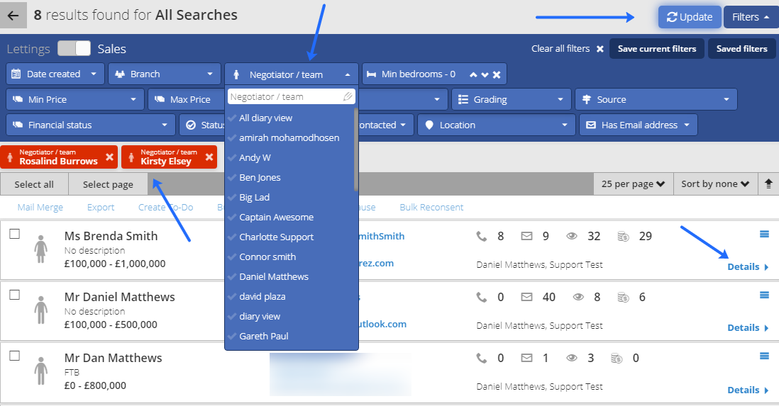 Click on the 'Filters' icon to filter the list as you wish, for example, by negotiator you want to re-assign from. Click 'Update' once you have selected the filters you want. These will show up as an orange box. To remove any of these filters, simply click the 'x' on the orange filter you want to remove. Once you have the selected list, click into the 'Details' section of the applicant/ vendor card.