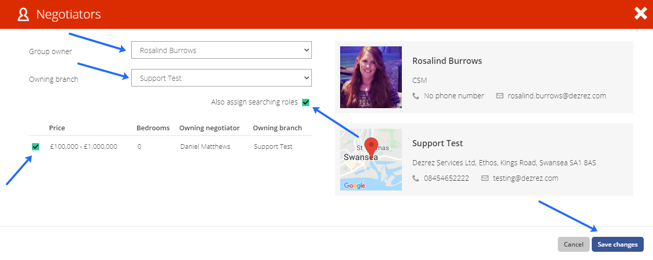 Once here, select the new negotiator you wish to assign to this contact, select the new branch (if needed) and be sure to tick the 'Also assign searching roles' to ensure any active searches are also reassigned. Once this is all complete, select 'Save changes'.